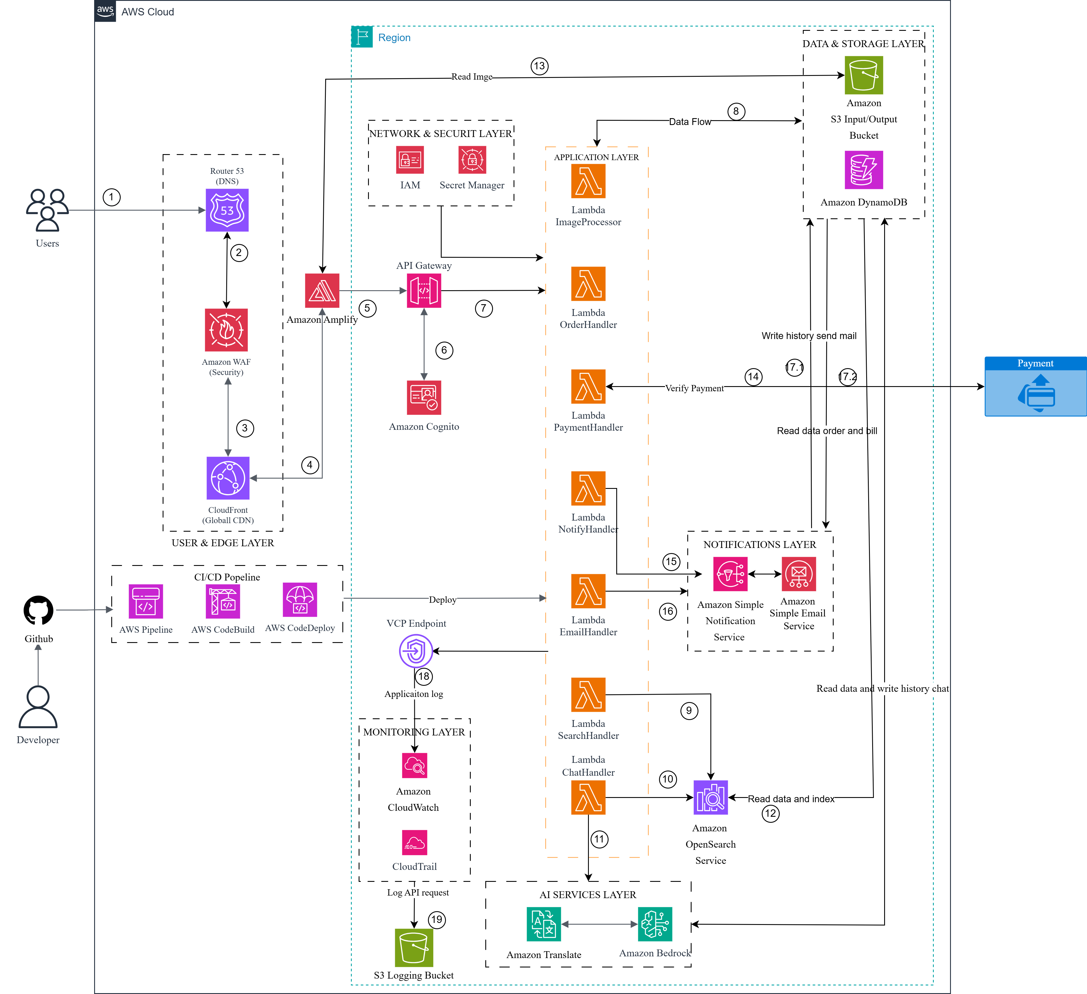| AWS Lambda | Server-side logic | Handles order processing, payments, authentication, email sending, without dedicated servers. |